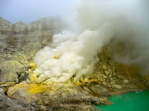 Traditional sulfur minersOne of the visitor's attention in the crater area is the traditional sulfur miners. They boldly approached the lake to explore sulfur with simple equipment and bear the basket.This sulfur miners take sulfur from the bottom of the crater. Here the smoke is thick, but with equipment such as gloves masks to the degree necessary, they are still looking for the molten sulfur. Molten sulfur derived from the piping leading to the source of the volcanic gases that contain sulfur. This gas is then piped out in the form of molten sulfur red. Once frozen sulfur yellow.After the sulfur is cut, the miners would carry it through the path. The burden is quite heavy between 80 to 100 kg. The miners are used to carry heavy loads, as she walked along the path on the caldera cliffs down the mountain as far as 3 kilometers.